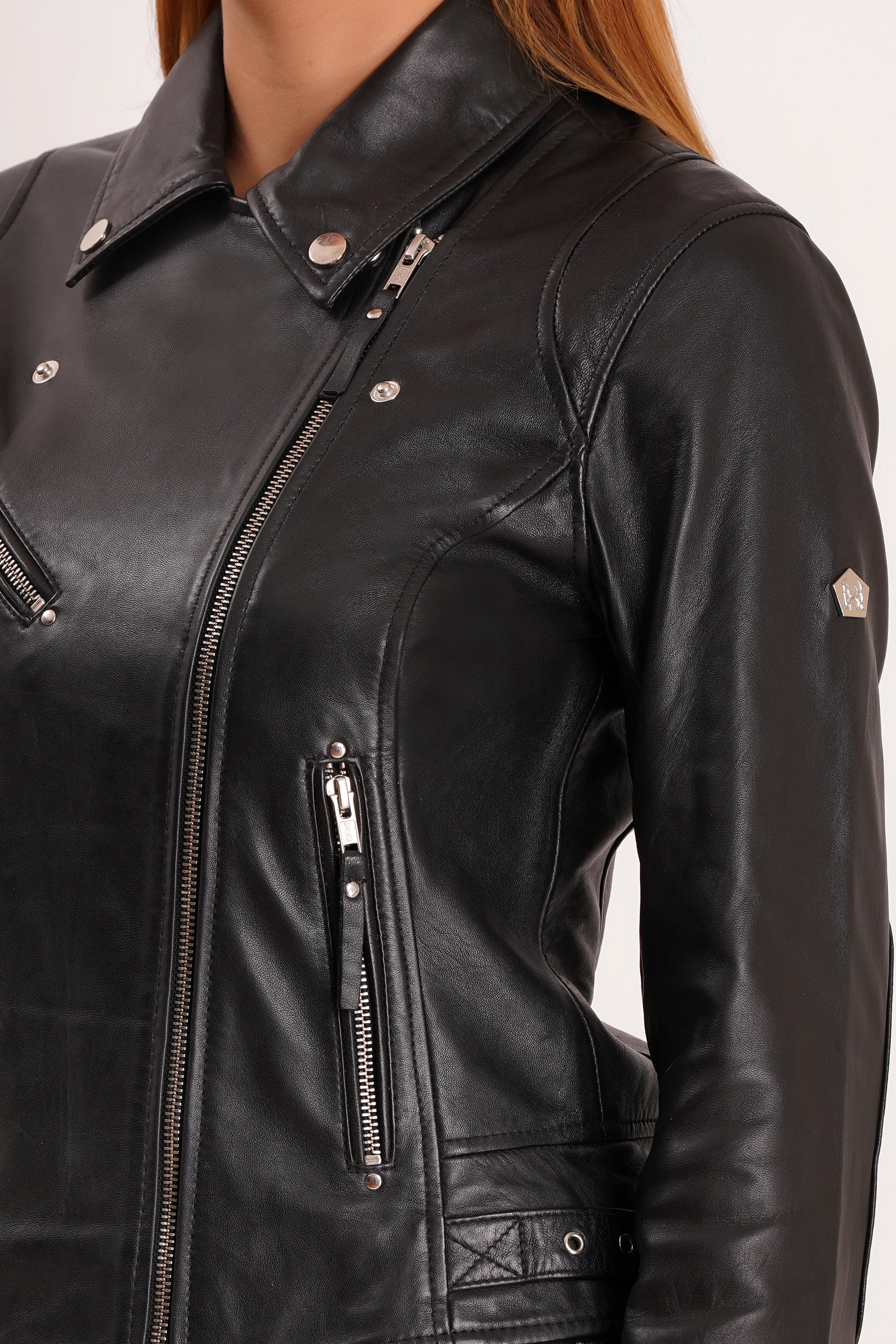 Biker chic incoming. Exquisitely crafted in buttery - soft, 100% top grain SHEEP leather, our washed detailing gives this classic motorcycle jacket the perfectly broken-in, vintage look. Silver hardware, like our robust zip details on the sleeves and pockets, and snap button lapels give this jacket a stylish edge. It's timeless investment piece (minus the investment).